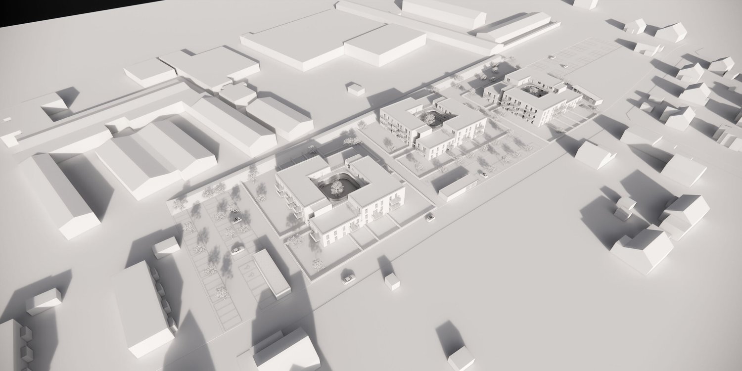 Die einzelnen Baukörper sind quadratische Hofgebäude mit einem zentralen Atrium. Die Seitenlängen betragen 35 Meter, die Trakttiefe im EG und OG beträgt 9 Meter, eine Teilunterkellerung ist vorgesehen. Der großzügige, offene Innenhof ist mit einer Seitenlänge von 17 Metern ebenfalls quadratisch dimensioniert. Dadurch entstehen nicht nur hervorragende Belichtungssituationen für sämtliche Wohnungen, sondern auch eine intime Atmosphäre für die Bewohner mit einem hohen Identifikationspotential.